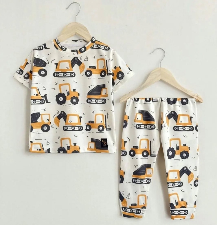 ست راحتی کودکانه تیشرت شلوار طرح ماشین های ساختمانی